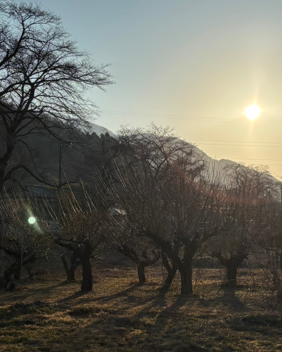 山の向こうに夕暮れはじめた頃、道の脇に、小さな梅の花が咲いているのに気づきました。