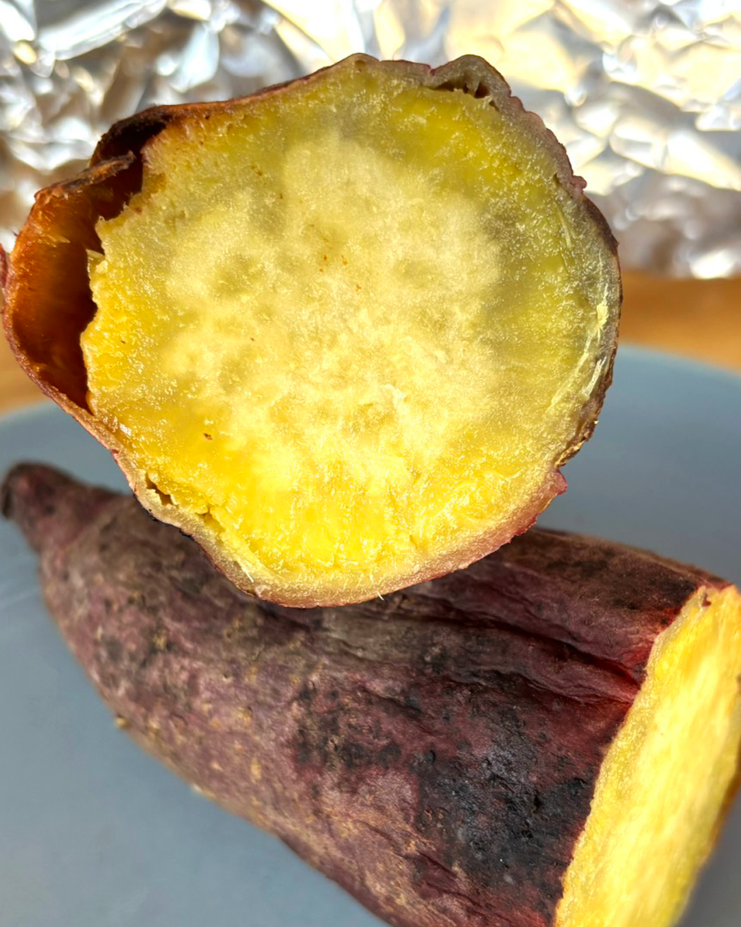さらに外側を厚みのあるアルミホイルで覆うことで急激な加熱を防ぎ、内部まで穏やかに熱が伝わります。この“ゆっくり”が大切で、さつまいもに含まれるデンプンは60〜70℃ほどの温度帯でじっくり糖へと変わり、甘さが引き出されるようです。
