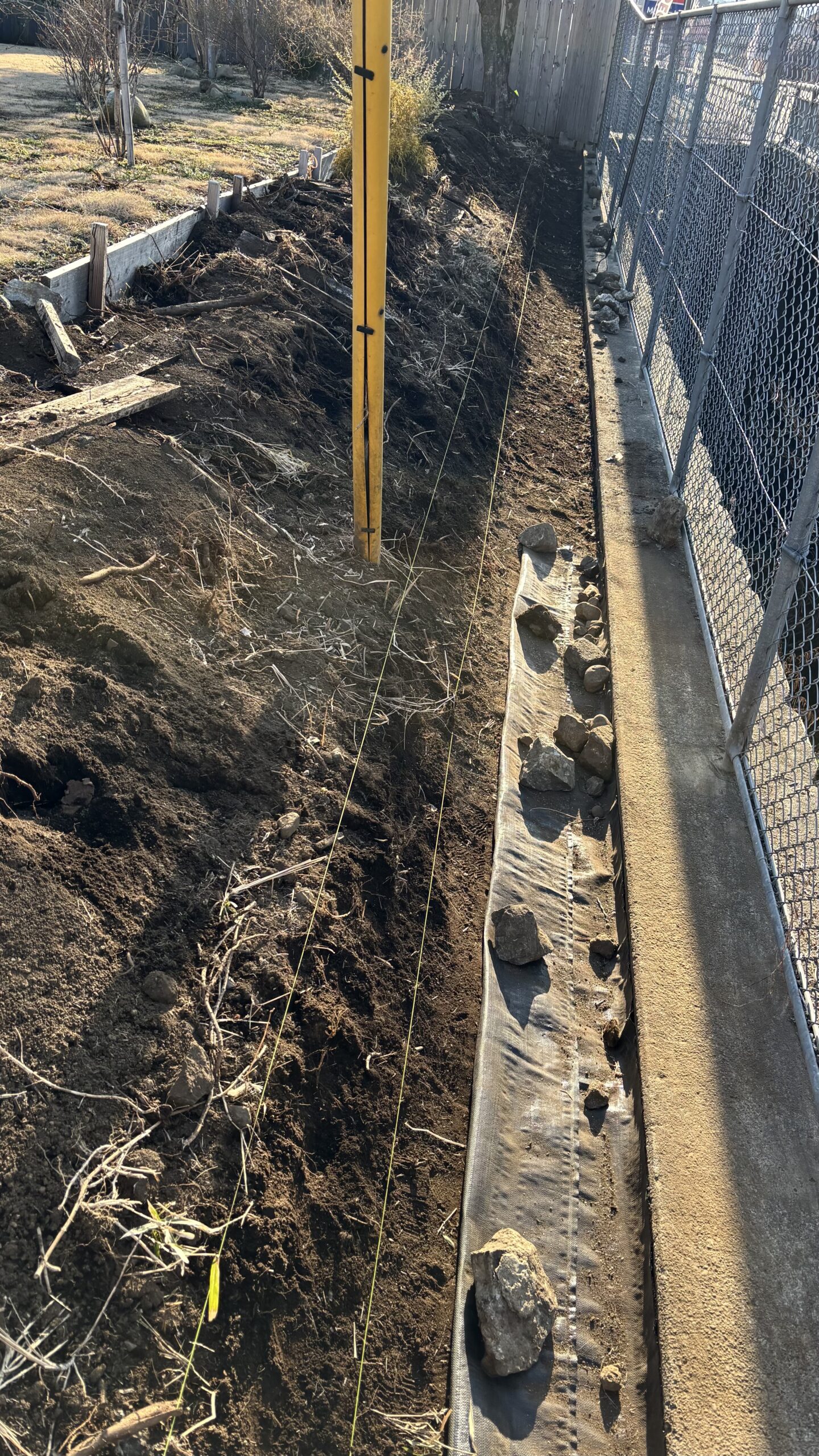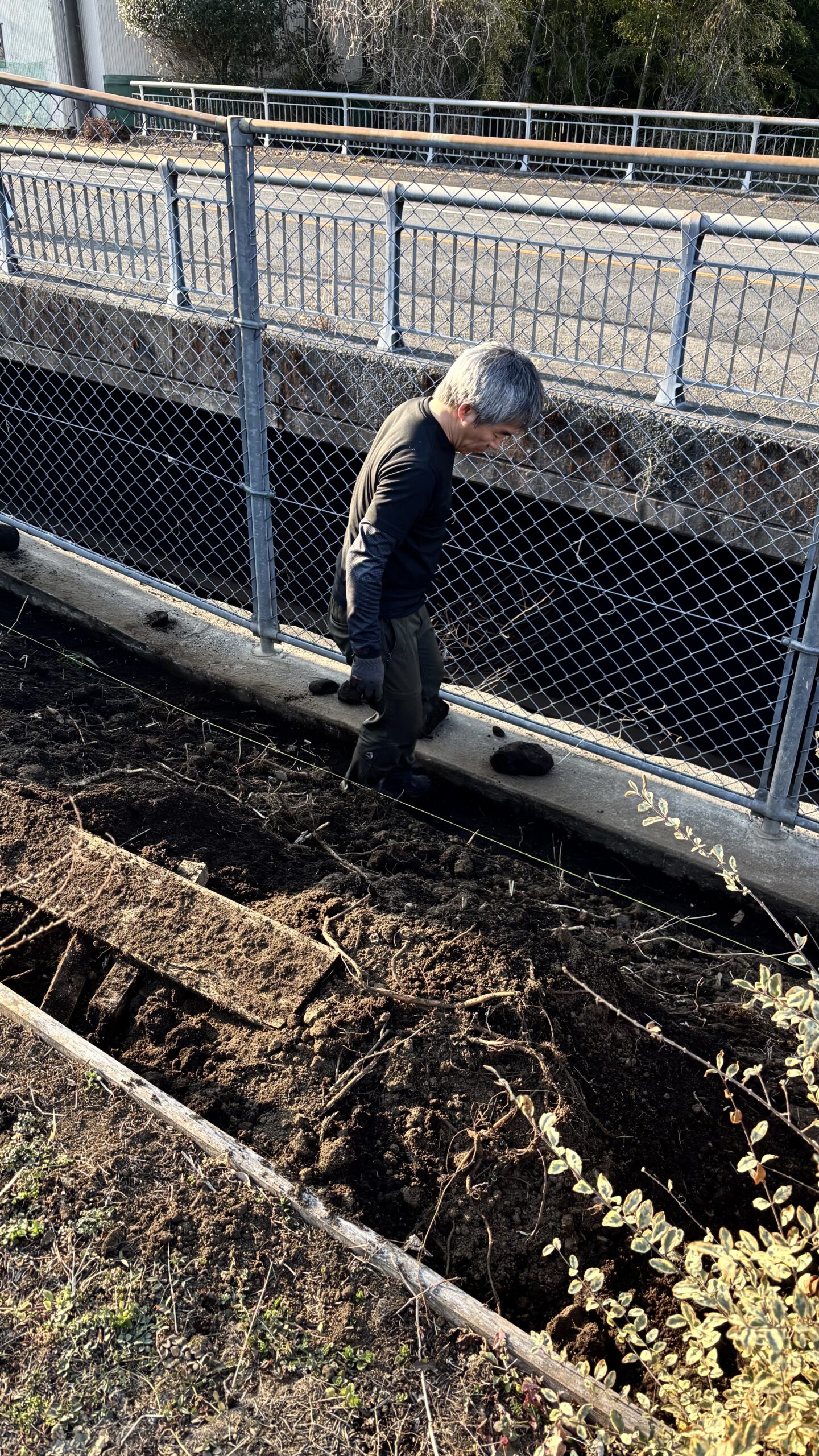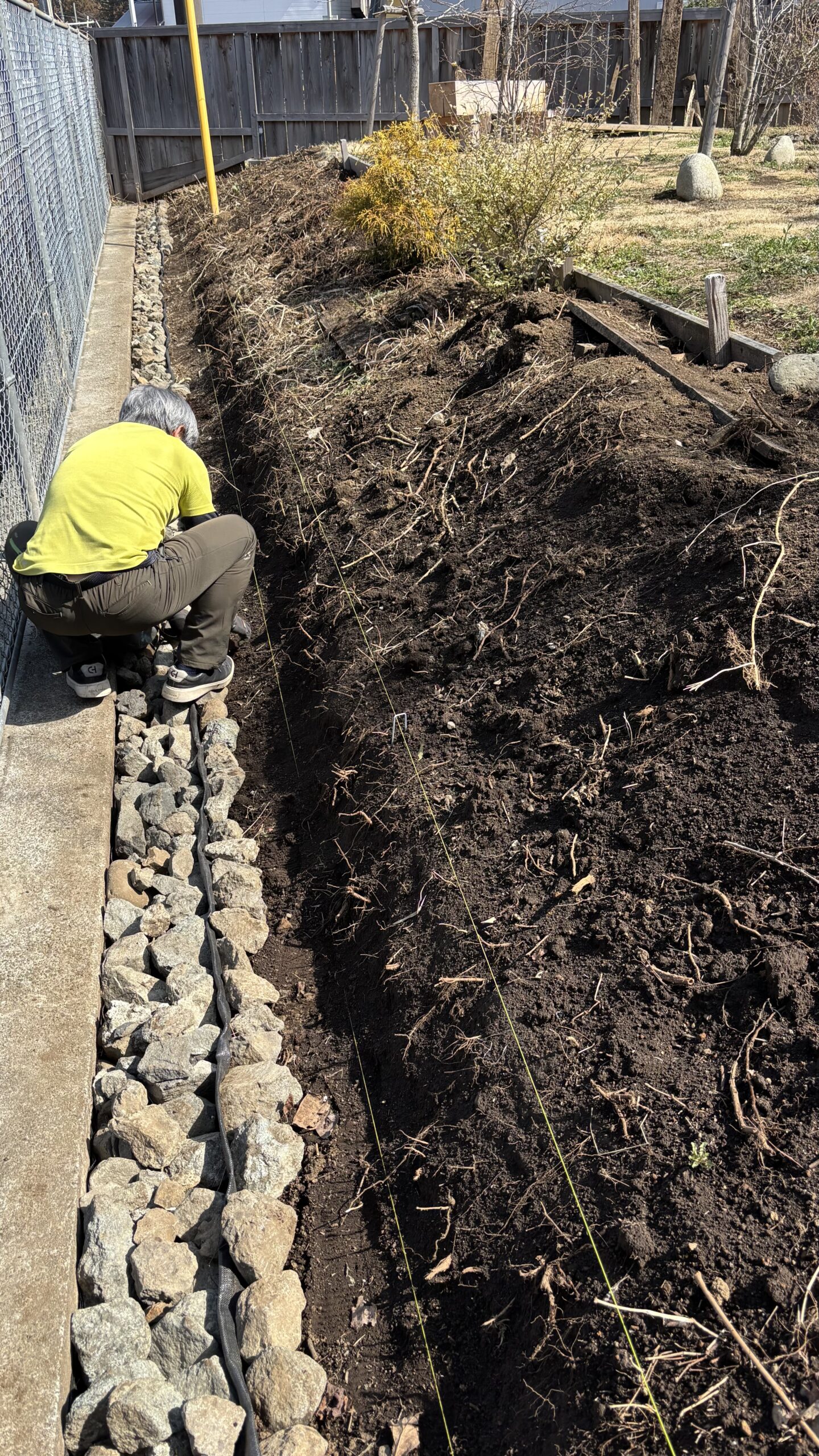 そこで、まずは斜面を留めていた古い木板をすべて外し、石を積めるように深めに掘り直し、今日は一日かけて石を詰めてから土を軽く固め、下地を整えました。