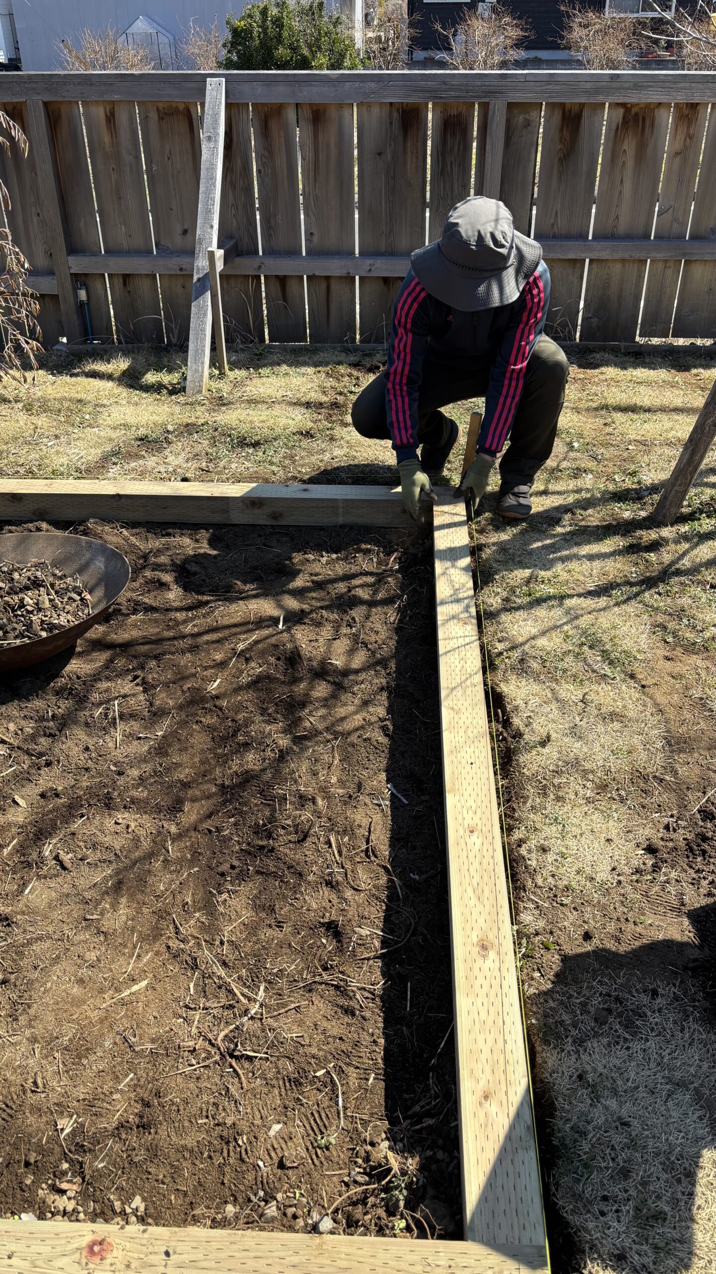 石や砂利を敷く前に地面をならし、防草シートを引き、防腐処理した10センチ角の木材を仮置きして、どの位置がいちばん落ち着くか、少し離れて何度も眺めながら決めていきました。
