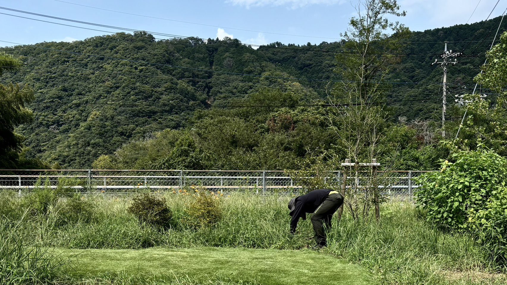 この写真は、2024年9月ごろの写真。まだ芝生も敷ききれていなくて、雑草と格闘している様子です。