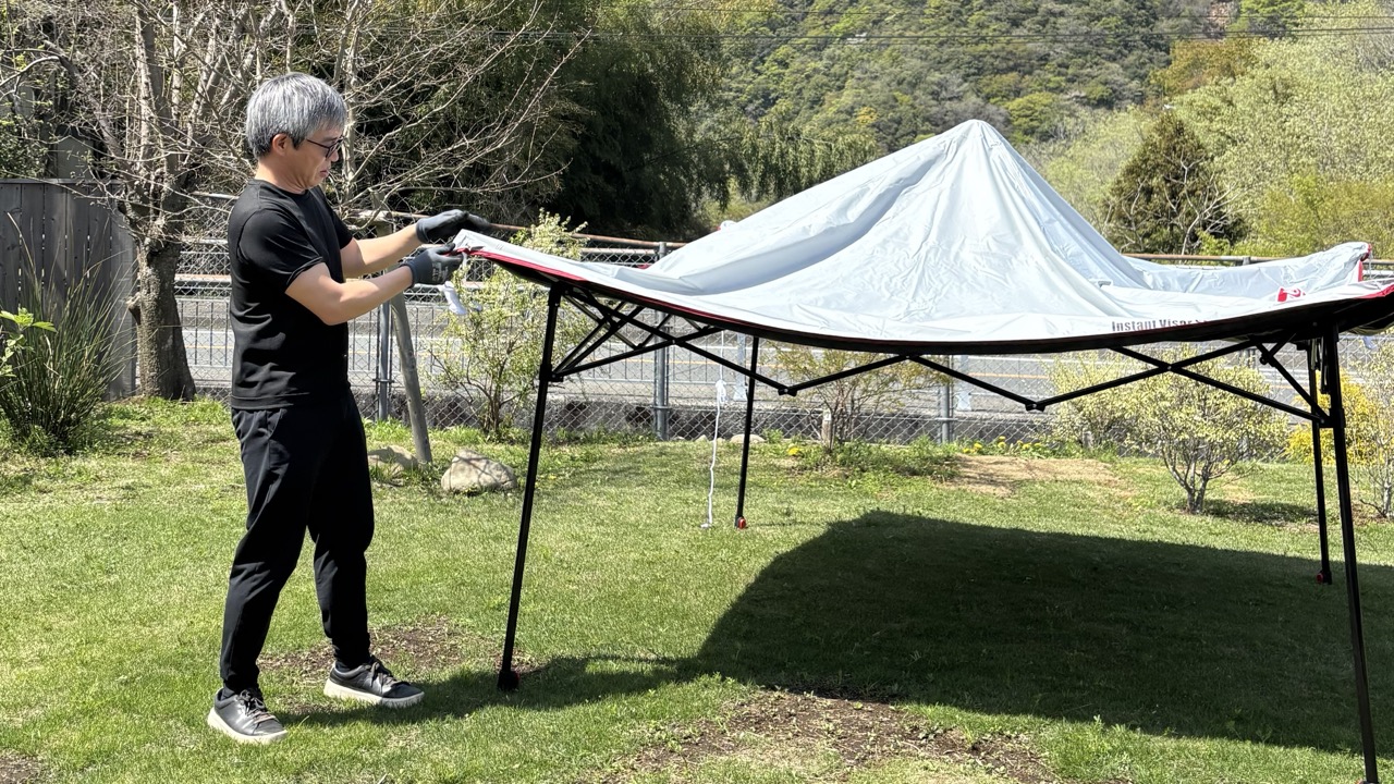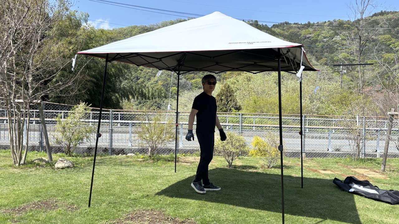設営は1人でも簡単という口コミ通り、脚を少しずつ広げてシェードを被せ、最後は傘を開くように「パチン!」とロックするだけ。初めてでも迷うことなく、あっという間に心地よいプライベート空間ができあがりました。