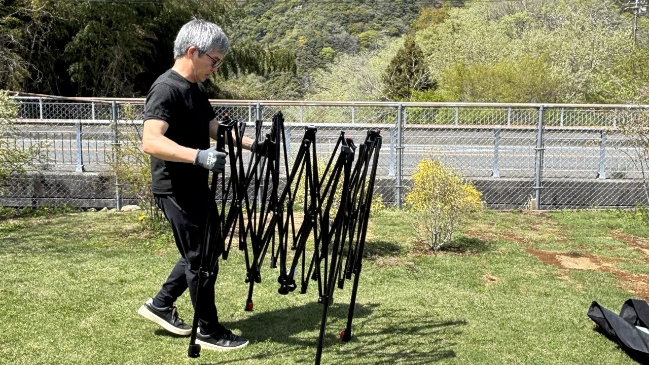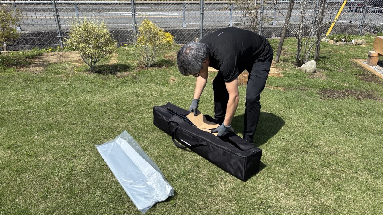 実際に持ってみると、約13kgというずっしりとした重みを感じます。ですが、この場所特有の急なつよい風を考えると、この重さとさらに四隅をペグでしっかりと固定すれば、より安心です。