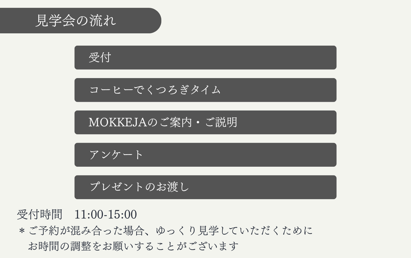 11/22(土)MOKKEJA秋の見学会 受付時間は11:00-15:00です