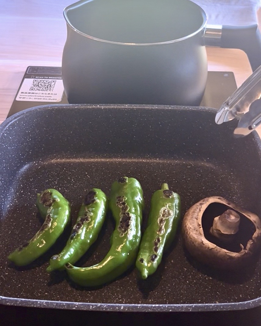 朝起きたら、採れたての野菜を焼いて朝食に。
