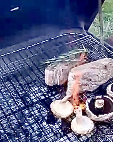 庭に植えたハーブを採ってきて、その場で肉の香り付けに。